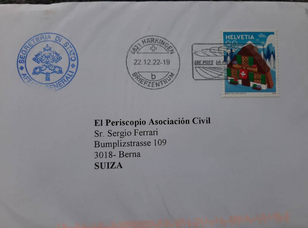 La misiva del Papa del 20 de diciembre de 2022, sin embargo, fue mucho más allá de un simple gesto formal. En su segundo párrafo puntualiza: “los animo a seguir adelante trabajando con audacia por la construcción de una sociedad justa y fraterna”. Con membrete vaticano, con la firma de puño y letra del propio Francisco y con el sello de su Secretaría particular, resucitada hoy del archivo de la Asociación El Periscopio, esa carta adquiere un valor particular. Se convierte no solo en una pieza histórica por su importancia institucional, sino que se proyecta como un desafío actualizado para continuar el compromiso diario a favor de la Memoria, Verdad y Justicia en la perspectiva de una Argentina más “justa y fraterna” y de Otro mundo posible.